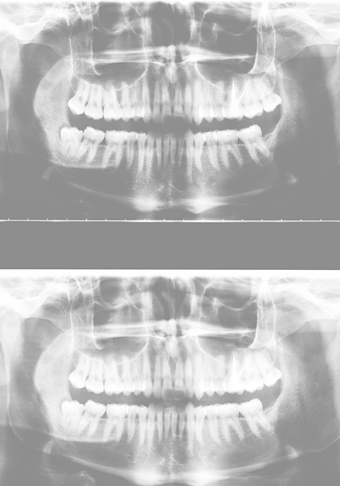 Brakuje jednego lub więcej zębów: Luki po usuniętych zębach należy uzupełnić mostem lub implantem.
